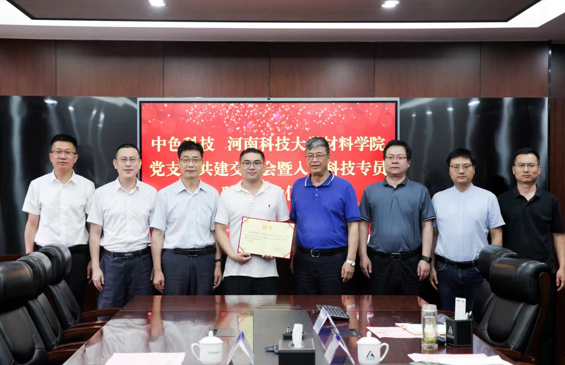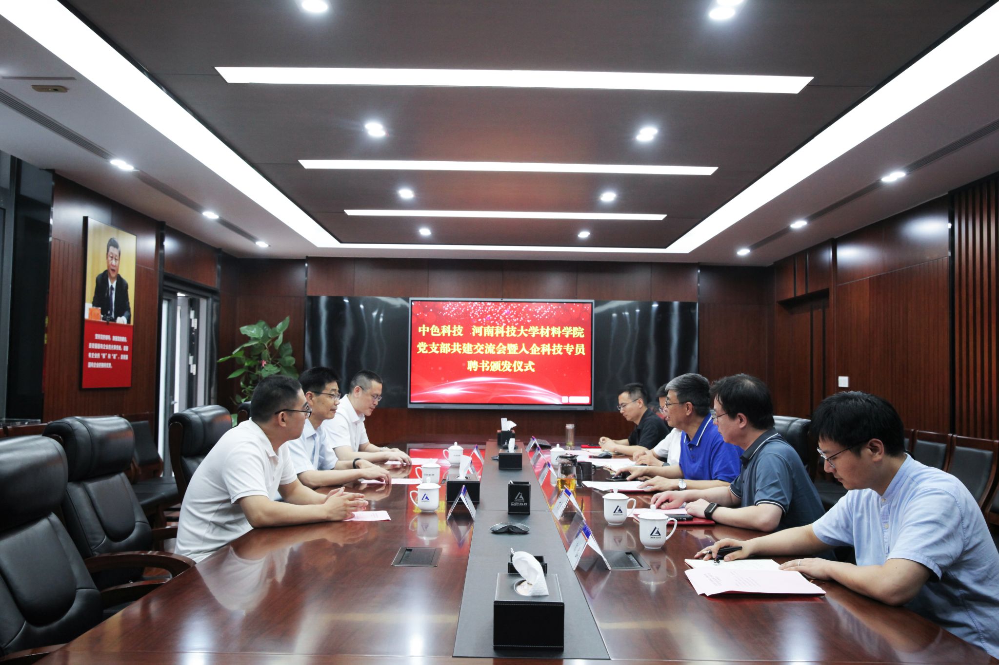 6月16日,学院党委书记李怀民一行到中色科技股份有限公司交流党建和科技创新工作,并举行入企科技专员聘书颁发仪式。公司主持工作的党委副书记、副总经理赵志锐出席交流活动,并为受聘的入企科技专员周孟博士颁发聘书。