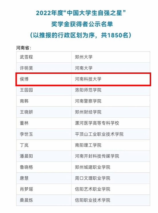 2020级材料科学与工程专业研究生侯博同学荣获2022年度“中国大学生自强之星”奖学金。
