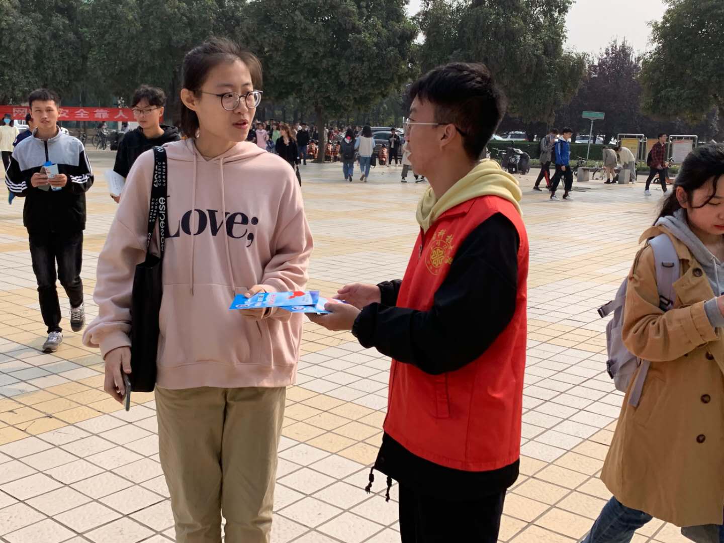 志愿者们身穿统一服装,在嘉园餐厅门口分发禁毒宣传手册并耐心向同学们普及毒品危害,鼓励同学们举报用毒藏毒行为。