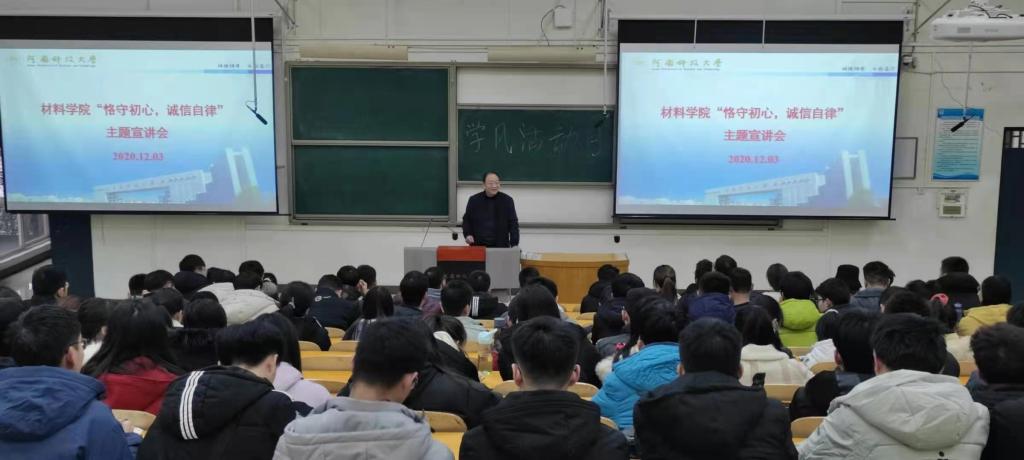 的指导思想,并要求同学们要爱校、爱专业。之后根据科技论文写作引出学术规范、学术道德以及科研诚信等相关热点话题,通过生动鲜活的实例向同学们展示了缺乏科研诚信的严重后果,并要求同学们要恪守底线,认认真真做学术。最后,给广大学子提出几点建议:树立远大目标;珍惜时间,不虚度光阴;养成自主学习的习惯。