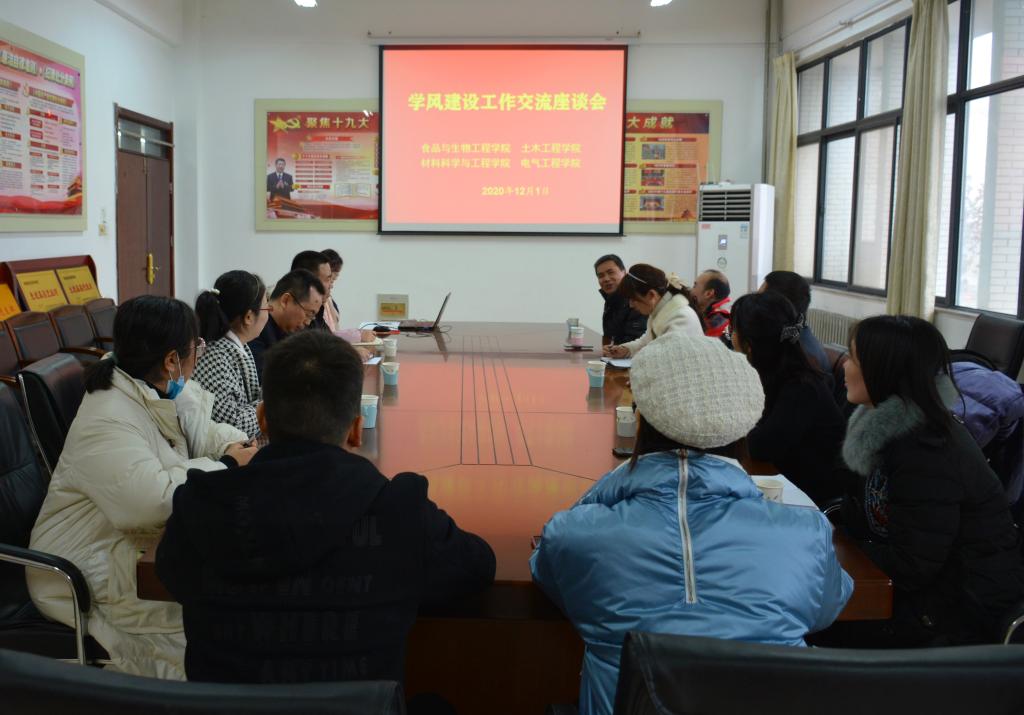 与食品与生物工程学院、土木工程学院、电气工程学院在工科一号楼203会议室举行学风建设工作交流座谈会。