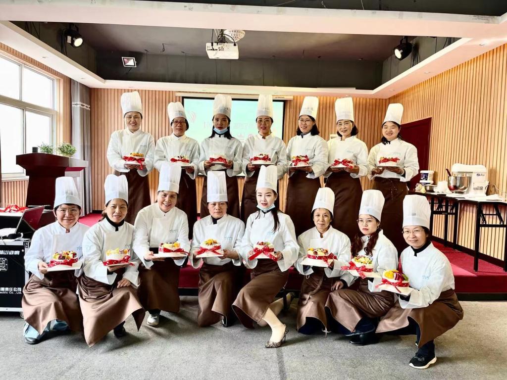 活动开始后,首先由专业蛋糕师分步讲解蛋糕的制作流程。随后,女教工们头戴厨师帽,身穿厨师服,变身蛋糕大师,开始发挥自己的聪明才智,认真制作起蛋糕来。蛋糕工作坊的空气中弥漫着淡淡的奶油香、水果香,耳边响起阵阵欢声笑语。经过一个多小时的精心制作,每位老师都匠心独具地做出了自己的创意蛋糕。