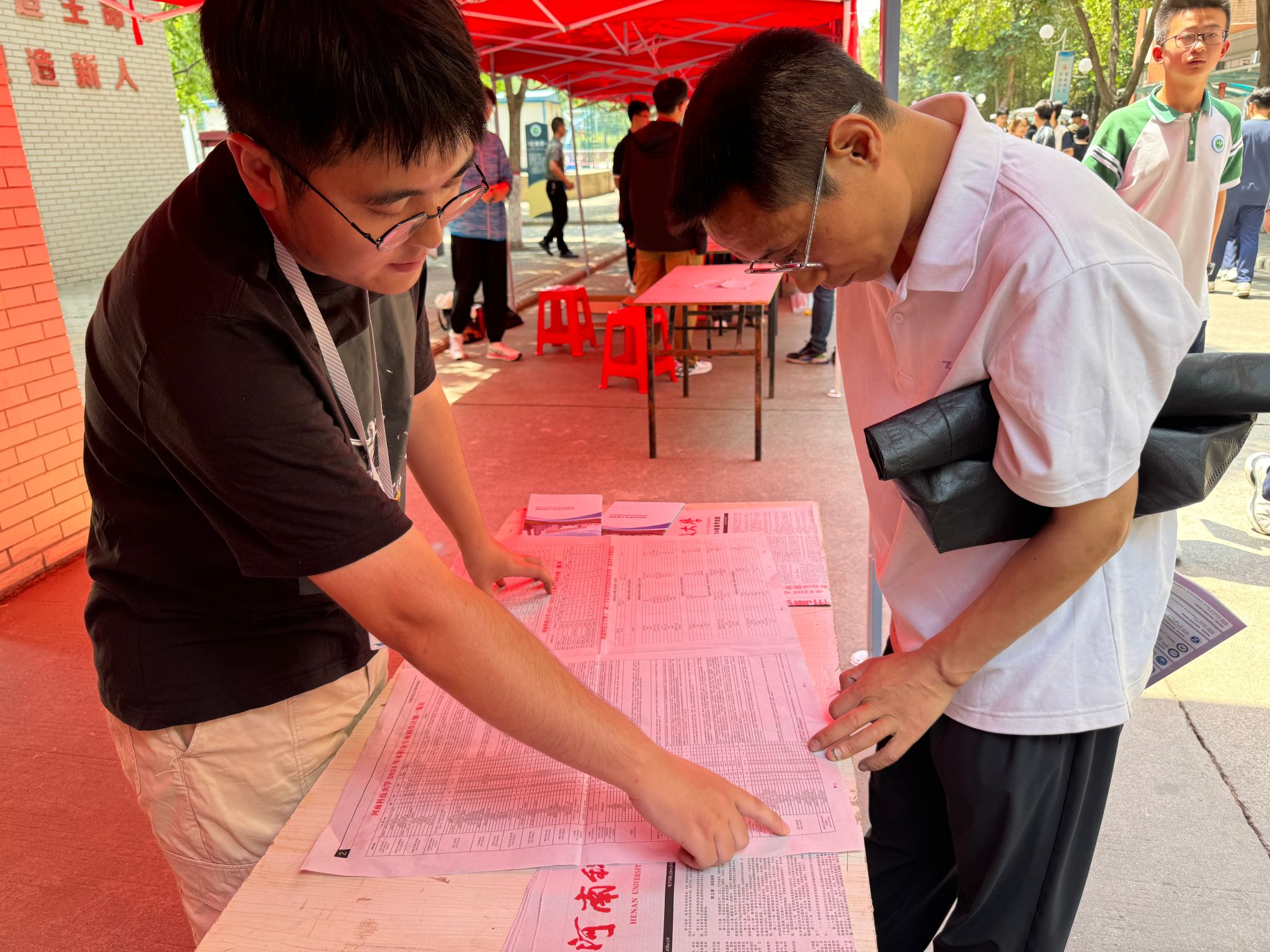 许傲为考生和家长发放招生宣传资料,详细介绍了学校、学院的专业设置、师资力量、学科建设、人才培养、招生政策和往年录取情况,耐心细致地解答了同学们报考及录取相关问题。