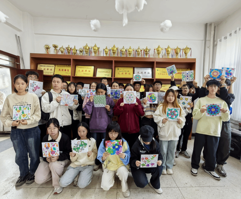 活动伊始,张欣先讲述曼陀罗,并讲述压力概念和列举大学生常见的压力,然后每位同学选择自己喜欢的曼陀罗进行绘制。