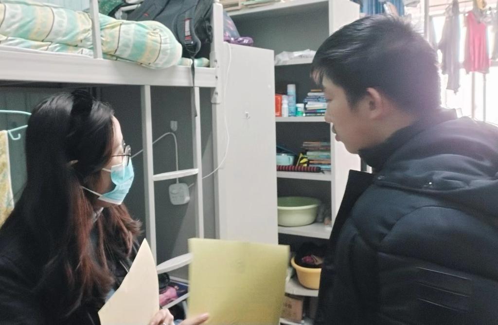 辅导员对宿舍安全隐患进行了全面排查,与同学们深入交流,听取学生反映的问题并一一记录,最后在宿舍张贴防疫宣传海报,并叮嘱同学们要提高安全防范意识,做好个人防护措施,保持寝室整洁卫生,遵守疫情防控规定,非必要不外出。