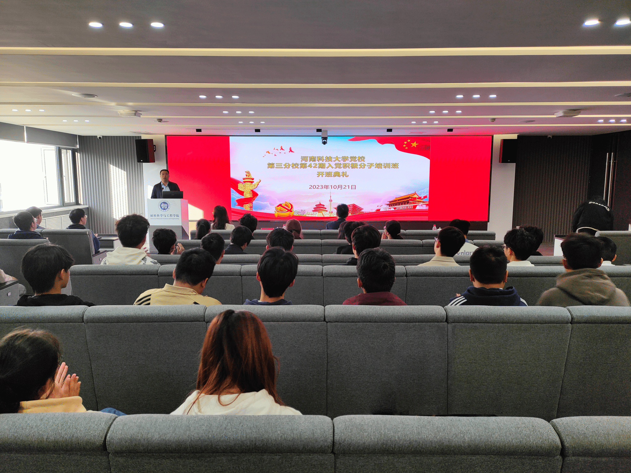 开班典礼在雄壮激昂的《国际歌》中拉开帷幕。李怀民致辞强调,作为一名入党积极分子,一定要坚持以党员的标准严格要求自己。一要加强理论学习,坚定理想信念。要深入学习习近平新时代中国特色社会主义思想、深刻领会党的二十大精神,加强对党的基础知识、基本理论、方针政策等的学习,深刻领悟“两个确立”的决定性意义;二要端正学习态度,力求学有所获。要珍惜机会,严肃认真地对待培训学习,严格遵守各项组织纪律,要将被动学习变为主动学习;三要坚持学用结合,争取早日入党。要主动将集中学习和个人自学相结合,将理论学习与社会实践相结合,学习上勤奋刻苦、实践中冲锋在前,将党的知识和理论内化于心、外化于行,自觉接受党组织的培养、教育和考察,争取早日成为一名共产党员。