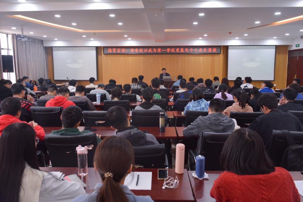 苏老师从“对大学的认识”“学校发展概况”和“个人成长体会”三个方面,循序递进、层层深入地为同学们进行了讲解,帮助同学们了解了校史、认清了现状、明确了目标、规划了未来。在“对大学的认识”方面,苏老师多维度、系统化地向同学们讲解了“什么是大学”“为什么上大学”“怎么在大学里学习”,教育大家要学好专业知识、锻炼综合能力、提升整体素质;在“学校发展概况”方面,苏老师用生动形象的事例为同学们上了一节生动的校史课,激发了大家爱校护校、融入学校发展的热情;在“个人成长体会”方面,苏老师结合个人成长体会,希望同学们在大学生活中坚持学习与思考,凡事严于自律,无怨无悔奉献。最后,苏老师希望同学们能够保持一种爱好,坚持一项运动,树立阳光心态,描绘美好人生,以责任心、判断力和持久力走向人生巅峰。