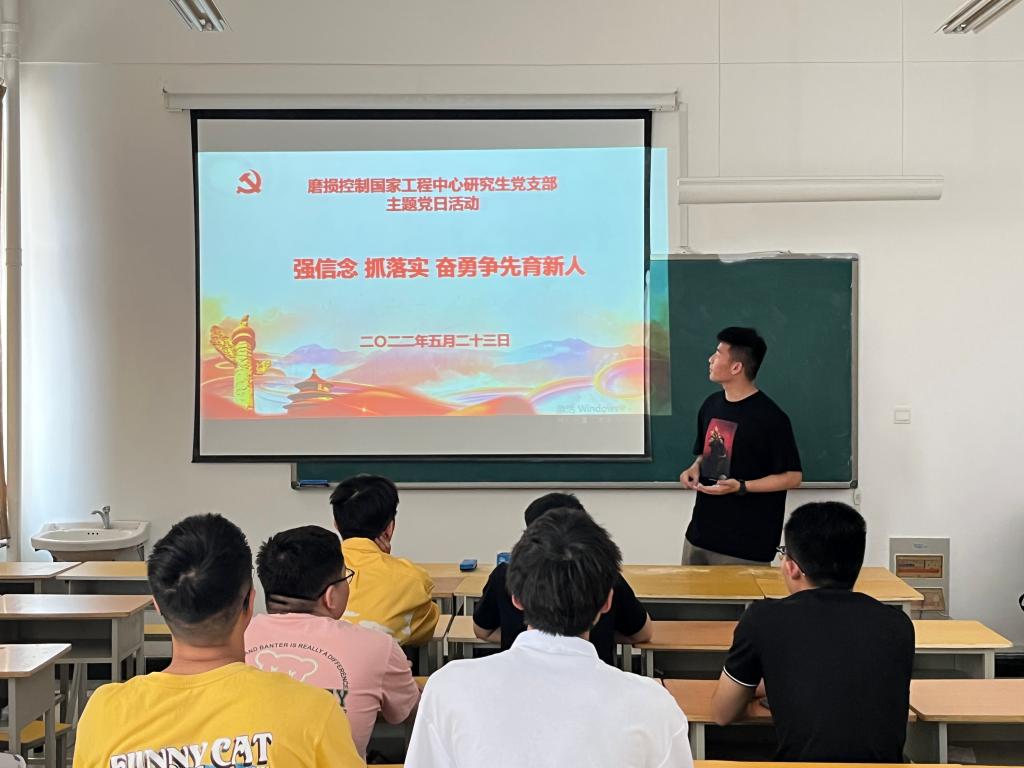 磨损控制国家工程中心研究生党支部在工科1-453教室开展了强信念 抓落实 奋勇争先育新人”主题党日活动。活动由支部书记郑鑫园主持,全体支部成员参与。