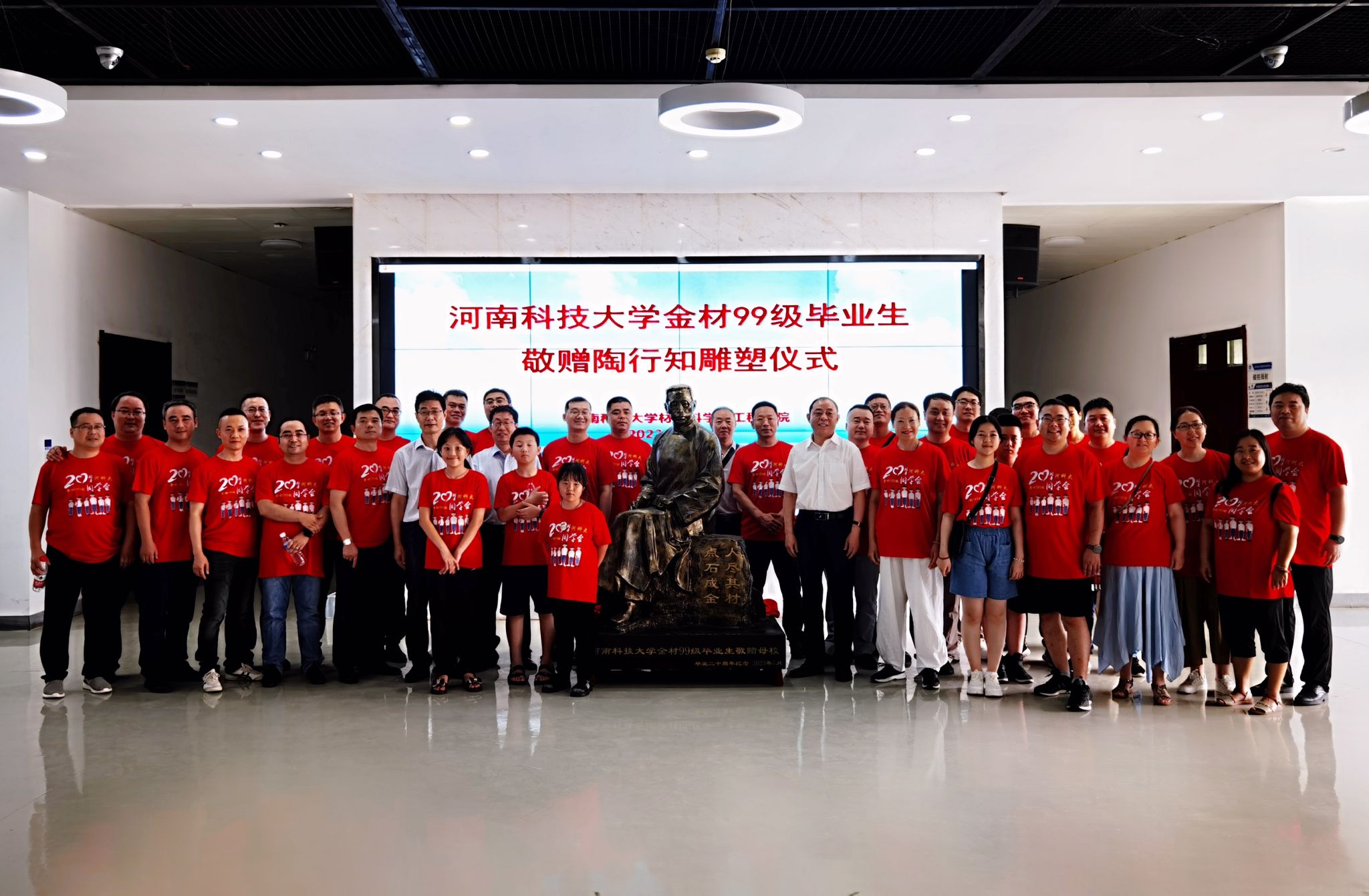 金材99级校友毕业二十年后荣归母校,重温学生时代的青春岁月,追忆昔年学校的美好回忆,并为母校捐赠陶行知先生雕塑,学校副校长、校友总会常务副会长李全安,学院党委书记李怀民、院长张柯柯、副院长张毅等出席捐赠仪式。
