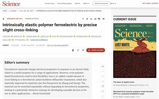 材料成型及控制工程本科2020届校友高亮在中国科学院宁波材料技术与工程研究所胡本林研究员和李润伟研究员的指导下,以第一作者在国际顶级学术期刊Science上发表了题为Intrinsically elastic polymer ferroelectric by precise slight crosslinking的研究文章(DOI:10.1126/science.adh2509)。团队在全球率先研发出了兼具弹性回复与铁电性的新型高分子铁电材料,有效解决了传统铁电材料在可穿戴领域难以在大形变下保持稳定性能的难题,开创性地同时将弹性与铁电性赋予同一材料,开辟了全新的学科方向—弹性铁电材料。该研究成果一经发表,随即引起了国际学术界的广泛关注,被央视新闻等多家媒体宣传报道,有望助推数字产业、新型功能材料、柔性电子等“361”万千亿级产业集群高质量发展。