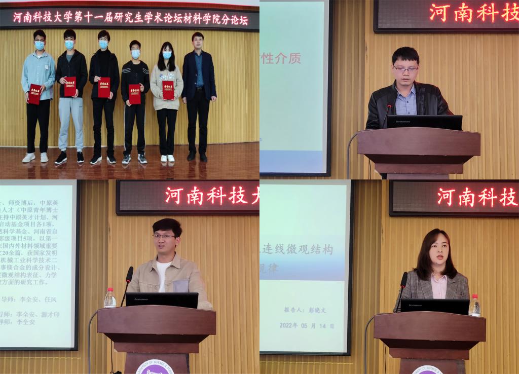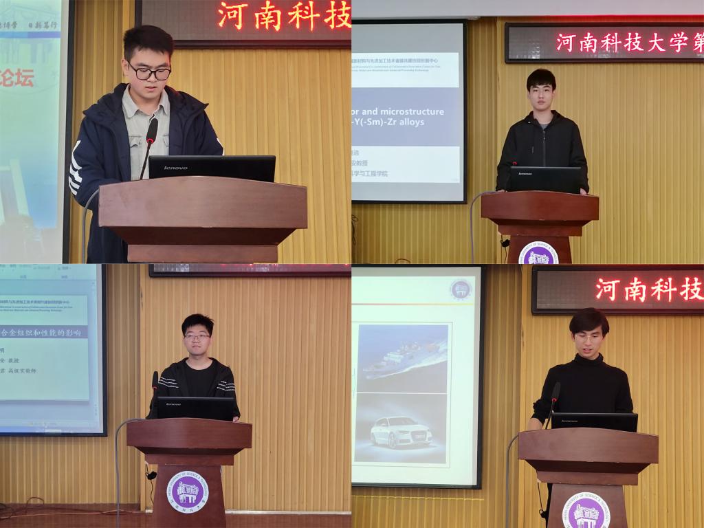 论坛上,优秀研究生代表张迁结合自身研究经历分享了学习心得,为低年级研究生开展课题研究和成果发表提供了宝贵的经验。相楠、陈晓亚和彭晓文三位博士,分别作了题为《航空发动机薄壁波纹构件粘性介质压力成形技术研究》、《Mg-Gd系合金微观组织演变及力学行为研究》、《深亚微米集成电路铜互连线微观结构和织构演化规律》的学术报告,详细介绍了各自领域的前沿研究内容、先进技术方法和最新科研成果,同学们踊跃与三位老师进行了交流和探讨。学术论坛优秀征文获奖代表庞浩、刘明明和蒋经轩同学,分别就论文的研究背景、理论基础、实验构思和结果讨论等方面进行了交流汇报。评委老师对获奖征文进行了点评并提出了修改建议,副院长皇涛向获奖同学颁发了荣誉证书。